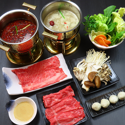 贅を尽くした極上の火鍋を味わうなら、こちらのコースで決まり!メインはA5ランクの霜降り和牛ロースと、お好きなお肉1種類を選べる豪華仕様!海鮮のホタテと自家製海老つくね団子も楽しめます♪野菜7種類、キノコ5種類と、食材も圧倒的なボリューム◎〆の後のデザートは、季節のパフェをご用意!特別な日のお食事や、ご褒美に是非どうぞ。※こちらのコースはご予約必須です