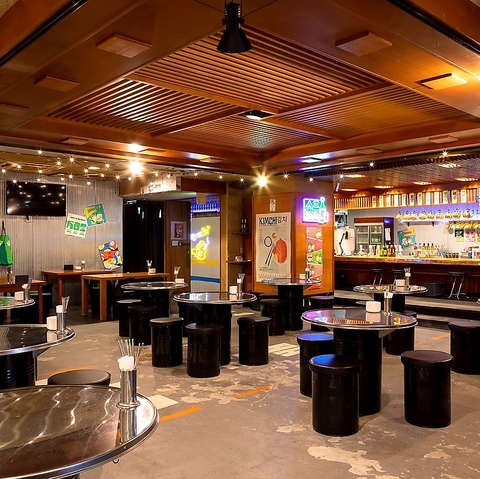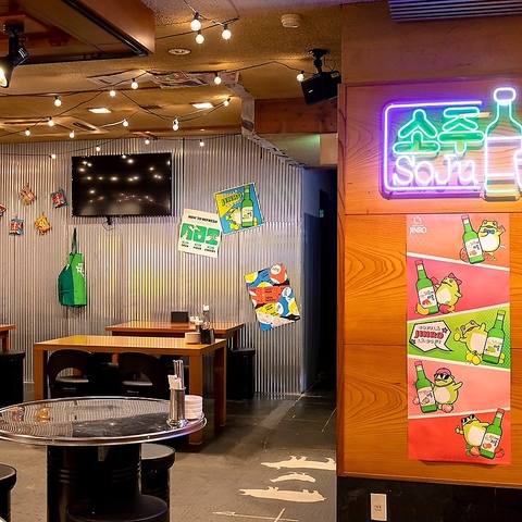 【韓国の雰囲気を感じるおしゃれな空間。】温かみのある照明と独特なデザインが、リラックスしたひとときを演出します。テーブルは広々としており、友人や家族と楽しい時間を過ごすのにぴったり!ぜひ特別な夜をお過ごしください。