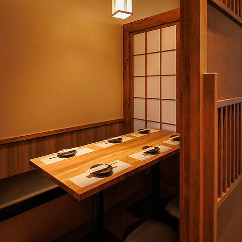 宴会・接待・女子会にも最適な扉付き個室!照明は柔らかく、心地良い距離感で会話も弾みます!和の趣きを大切にしながらもモダンな要素を取り入れた空間で、非日常を感じるひとときを楽しめます!