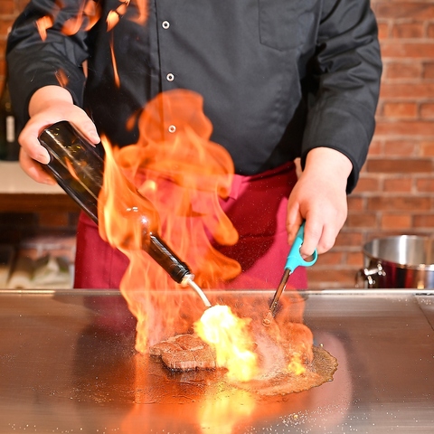 大きな鉄板を囲むカウンター席を設け、シェフが目前で焼き上げるパフォーマンスを間近で体感いただけます。