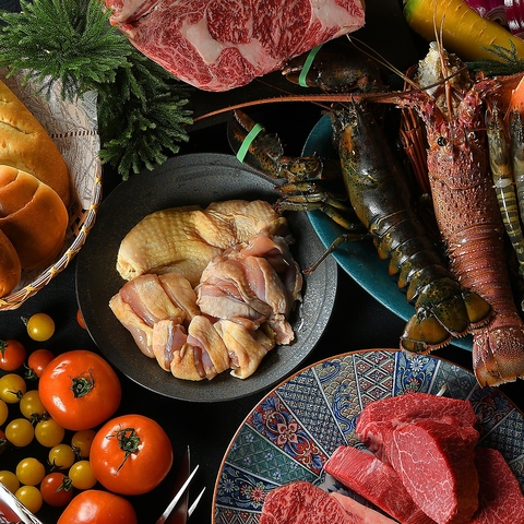 黒毛和牛のほか、国産黒豚、博多地鶏を使用したしゃぶしゃぶ・すき焼きもご用意。さらに、あわびやオマール海老、伊勢海老、タラバガニなどの海鮮料理も追加注文が可能。併設の人気海鮮酒場「ジャンボ釣船つり吉」の生け簀から選ばれた新鮮な魚介を鉄板で焼き上げます。