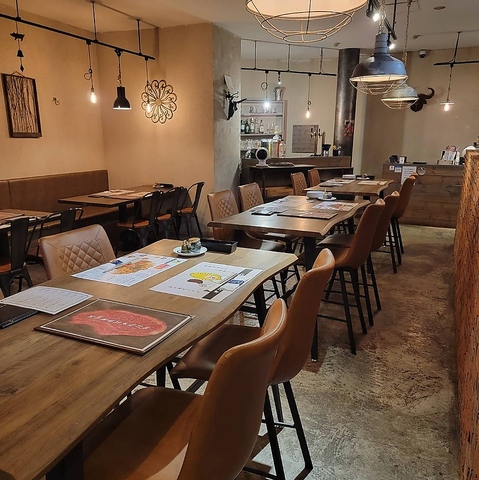 当店は、木と煉瓦を基調とした落ち着いた雰囲気の隠れ家的な肉バルです。明るすぎないライティングが心地よく、デートや記念日のお食事に最適なロマンチックな空間を演出いたします。