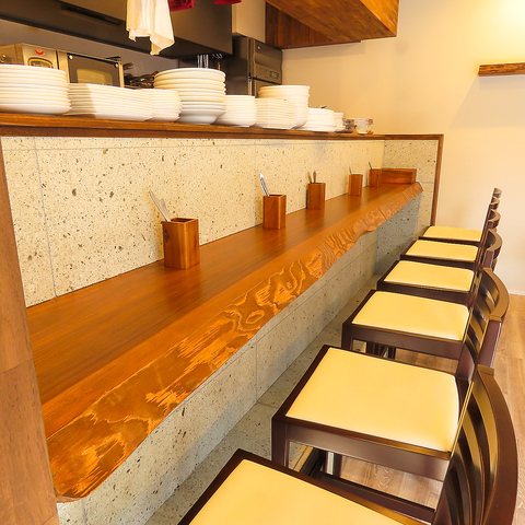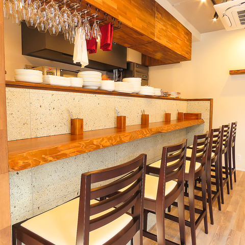 【お一人様・デートに】木の温もりを感じるカウンター席は、料理やワインを目の前で楽しめる特等席。お一人様やデートに最適です。