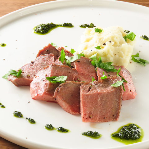 しっとりと火入れしたローストビーフに、チーズの香り漂う白いアリゴを合わせて