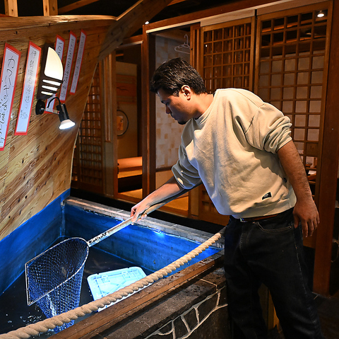 ≪屋形舟が店内に!?≫店内に浮かぶ屋形舟風のお座敷席もございます☆生簀を兼ねた水の上に10mの大きな屋形船風の客席が浮かぶ面白い造りの店内になっております!また店内はオープンキッチンで客席から魚を捌いてる光景がライブで愉しめる活気ある楽しい空間です!活きのいい活魚を職人が捌く光景をライブで楽しみ下さい