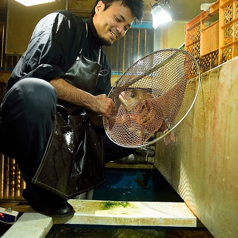いつでも天然活魚がお愉しみいただけるように店内には、約2トンの巨大生簀を完備しております。魚は漁師と直接取引をして素材の鮮度と安全にこだわります。漁師直送の天然活魚、そして市場直送の鮮魚の数々を目利き、厳選し丁寧に調理いたします。