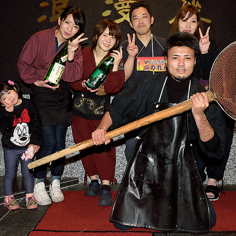 ≪屋形舟が店内に!?≫店内に浮かぶ屋形舟風のお座敷席もございます☆生簀を兼ねた水の上に10mの大きな屋形船風の客席が浮かぶ面白い造りの店内になっております!また店内はオープンキッチンで客席から魚を捌いてる光景がライブで愉しめる活気ある楽しい空間です!活きのいい活魚を職人が捌く光景をライブで楽しみ下さい