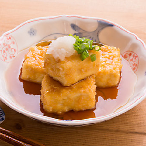 外はカリッと、中はふんわり仕上げた揚げ出汁豆腐。香り豊かな出汁が染み込み、やさしい旨みが広がる心温まる一品です。