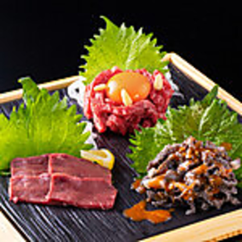 人気の高い新鮮なお肉のお刺身を少量ずつお楽しみいただける人気の盛合せです。