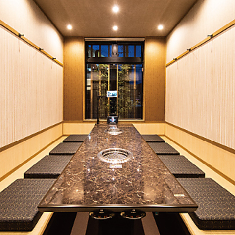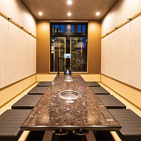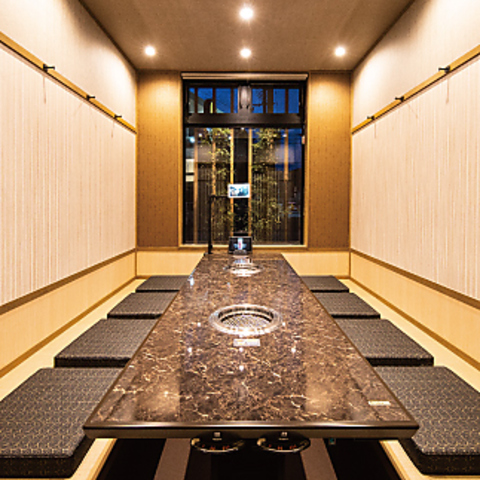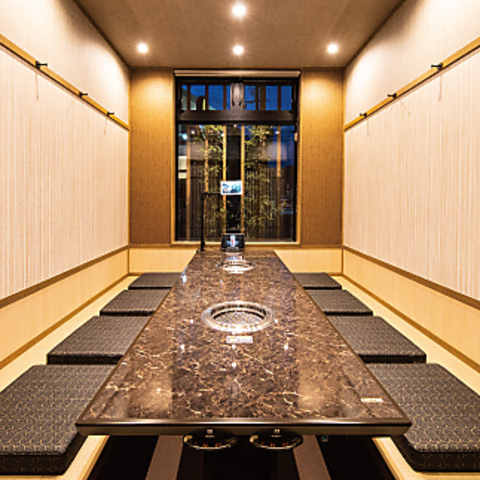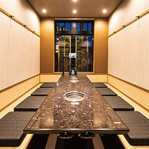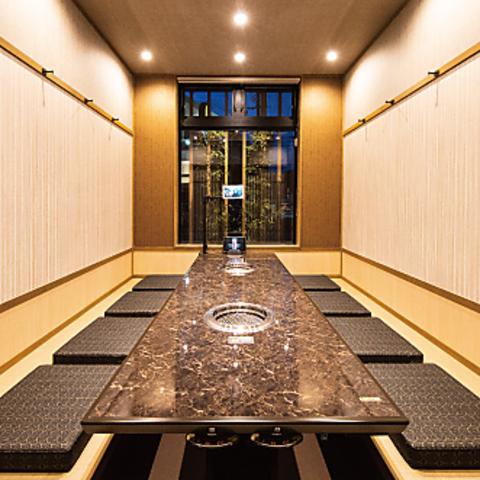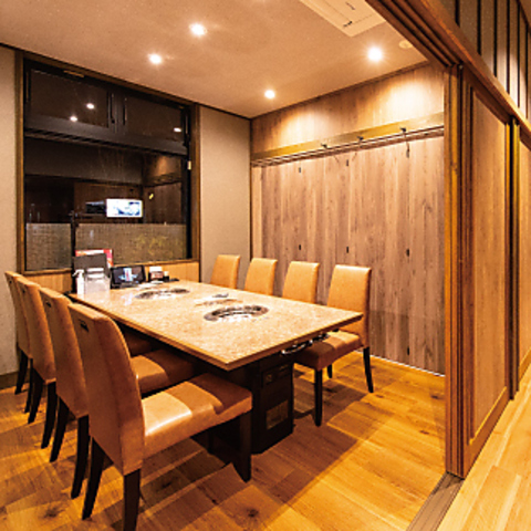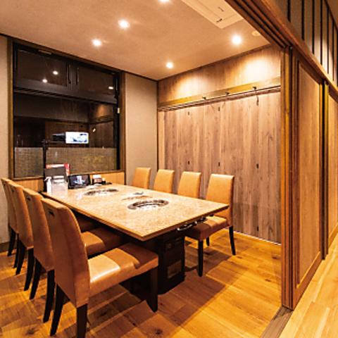 店内は和の趣を取り入れた、落ち着いた雰囲気です。周りを気にせずにお食事を楽しめる個室を多数ご用意しており、プライベートな空間でゆったりとした時間をお過ごしいただけます。掘りごたつ式の個室は、ご家族や大切な人との食事、接待にも最適です。シックな内装と照明が、上質な焼肉体験を演出します。