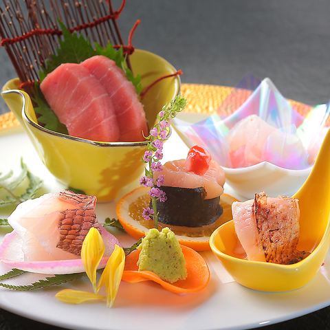海山の幸を贅沢にお楽しみいただける夜限定の会席コースです。旬の食材を使用するため毎月お料理内容が変わります。詳細は店舗へお問合せくださいませ。【例】・食前酒・前菜・お造り・焼物・煮物・蒸物・揚物・強肴・握り寿司・椀物・水菓子