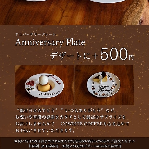 "誕生日おめでとう”"いつもありがとう”など、お祝いや普段の感謝をカタチとして最高のサプライズをお届けしませんか?COWRITE COFFEEも心を込めてお手伝いさせていただきます。/お祝い当日の3日前までにDMまたは(050-8884-2700)でご注文ください【予約】席予約不可 お祝いの方のデザートのみ取り置き可