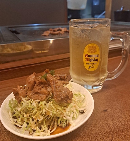 鉄板が設置された横並びのテーブル席は、お一人様でも気兼ねなく利用しやすいスペース。自分のペースで熱々のホルモンを焼きながら、店主との会話を楽しんだり、目の前の料理に集中したり、自由なスタイルで食事ができる空間です。