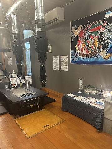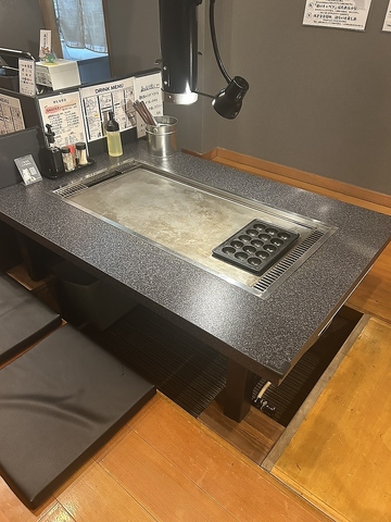 鉄板付きの座敷席は、床が一段下げられた掘りごたつ式。座布団が用意され、足を伸ばしてくつろげるため、長時間の食事や飲み会でも快適に過ごせます。親しい人たちとゆったりと食事を楽しみたい時にぴったりです。