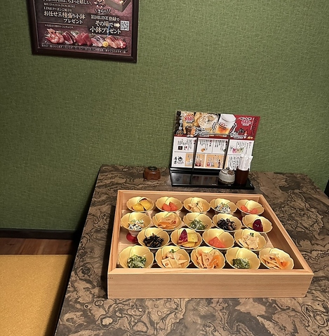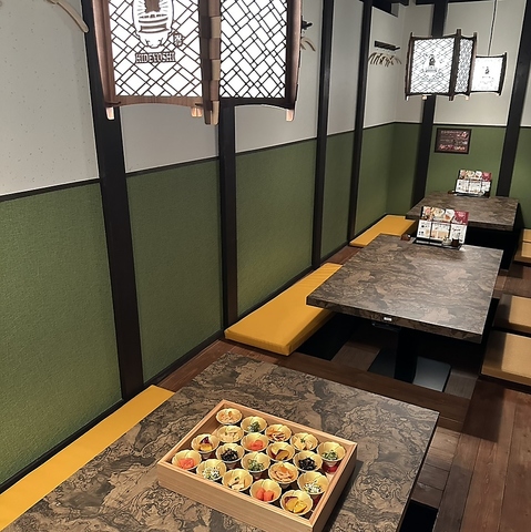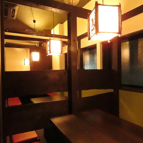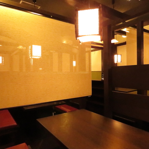 掘りごたつ席は、お客様に心からリラックスしていただけるよう、和の趣で統一されております。温かい光を放つ間接照明が、心地よい落ち着いた雰囲気を演出。日々の喧騒を忘れさせてくれるような穏やかな時間をお過ごしいただけます。ゆったりと足を伸ばして座れるため、長時間のお食事にも最適◎ご家族やご友人とぜひ、ご利用ください!