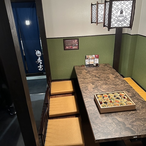 足をのばしてゆったりとくつろげる掘りごたつ席をご用意しています 。最大14名様まで対応可能。ご友人との集まりや、小さなお子様連れのご家族にもおすすめです◎