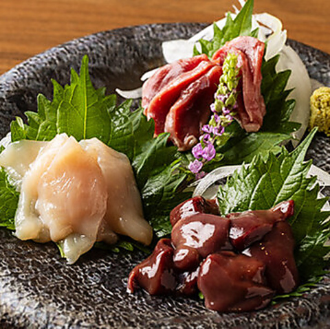 当店自慢の鶏刺し三種盛りは、毎朝仕入れる新鮮な朝引き鶏を使用しており、鮮度はまさに抜群!香ばしくジューシーでありながら、噛むほどにほのかな肉の甘みが口いっぱいに広がります。この鮮度だからこそ楽しめる弾力のある歯応えが特徴です。素材の良さが際立つ、当店イチオシの贅沢な一皿をぜひご堪能ください。