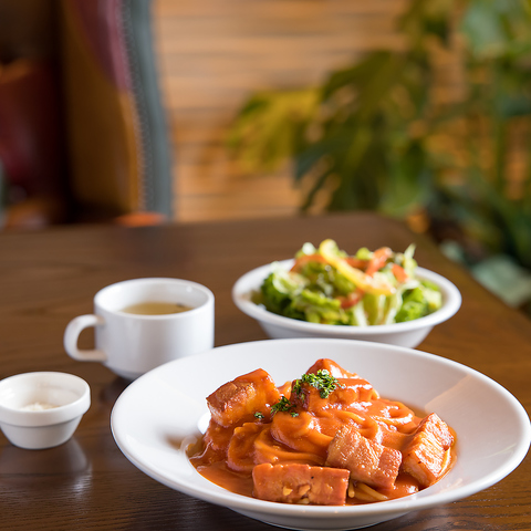 ワンプレートランチには、自家製ドレッシングで味わうパイミーシパンのアレンジサラダや、シャキシャキ食感のレタスサラダを添え、彩りも美しく仕上げています。一皿でさまざまな味わいを楽しめる満足感たっぷりの内容で、見た目も華やか。丁寧に作られたサラダとメインが一緒に楽しめる、心も満たされるランチです。