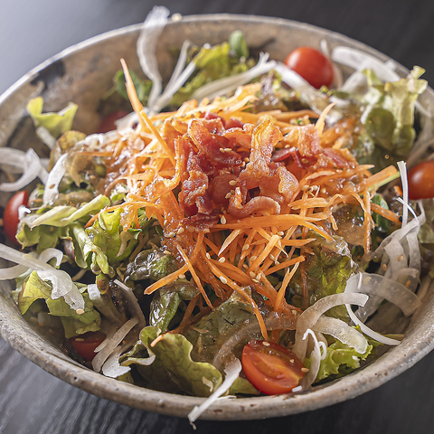 カリカリに焼いたベーコンと胡麻醤油ドレッシングのサラダです!!