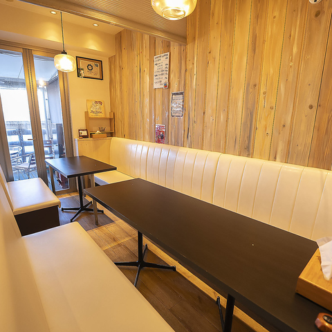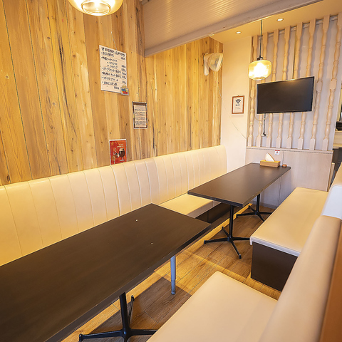 【ソファー席4名掛け×2卓】広々とした空間に配置された4名掛けソファー席は、柔らかな照明と木目調の内装で落ち着いた雰囲気。少人数での食事や女子会、ゆったり過ごしたい方にぴったり。クッション付きで長時間の滞在も快適です◎