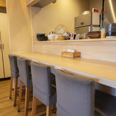 【カウンター1名掛け×4卓】お一人様でも気軽に立ち寄れるカウンター席は、ゆったり座れる高めのチェアで居心地抜群。目の前でスタッフの動きが見えるライブ感も魅力。仕事帰りの一杯や、ちょっとした食事にもぴったりの空間です♪