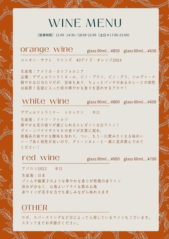 ロゼ、スパークリングなど日によって入荷しているワインもございます。スタッフまでお声掛けください。