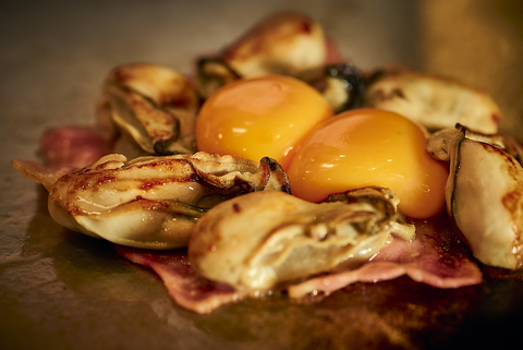 カリカリに焼いたベーコンに、ぷりぷりのカキを乗せて。オリジナルソースをカキに絡めてとろとろの食感。