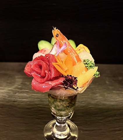 西尾抹茶をシャリに混ぜ込みその上に海鮮をふんだんに盛り付けパフェ風に仕上げた見た目も華やかな当店自慢の一品。