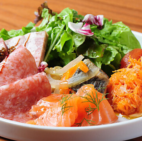 色鮮やかな前菜盛り合わせは、ゲストの好みに合わせて当日のおすすめを一口サイズで厳選した贅沢なひと皿。写真は1~3名で気軽に楽しめるハーフサイズで、もっと華やかに味わいたいグループにはシェアにぴったりのレギュラーサイズもご用意。最初のひと皿からテーブルが華やぎます。