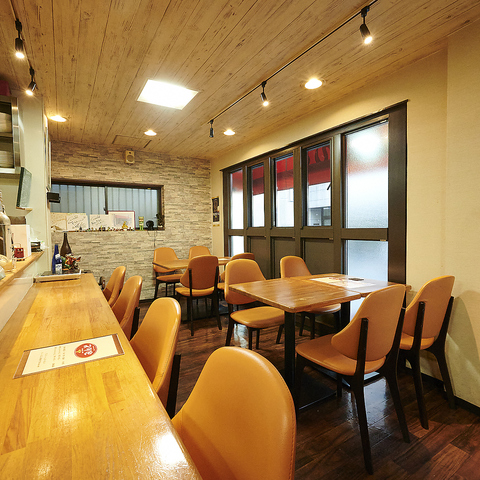 温かみのある木目調の床とテーブルに、落ち着いたグレーの石積み風の壁紙を組み合わせた、モダンでありながらアットホームな店内です♪お席はお一人様やデートに最適なカウンター4席に加え、グループ利用に便利な4名テーブルが3卓あり、テーブルは結合可能なため、宴会など様々なシーンに合わせてご利用いただけます!
