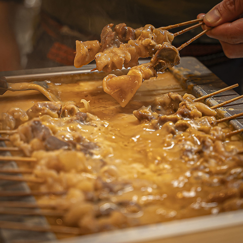外はサックリ、中はフワフワの衣をまとわせた串かつに、自家製のオリジナルブレンドソースをたっぷり浸して召し上がれ!創業時から継ぎ足しの秘伝のソースは、ウスターソースをベースに店内で甘めに仕上げております。一口食べればもうすっかり虜に♪