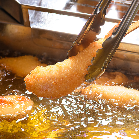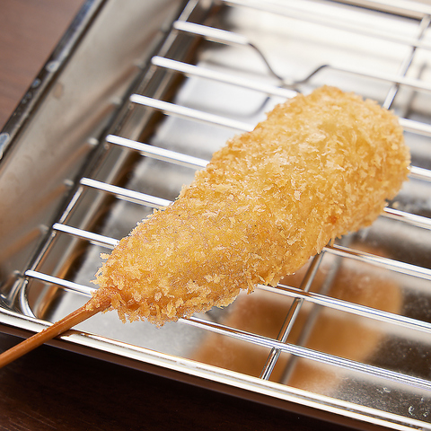山芋をたっぷり使用し、極細のパン粉をふんわりとまとった衣は、中はフワフワで、外はカリッ、噛めばもっちりとした食感。食欲をそそる堪らない食感です。ひとくちでパクリといただくことがミソ。油切れもが良くサックリ軽い!当店ならではの『串カツ』をご堪能ください。