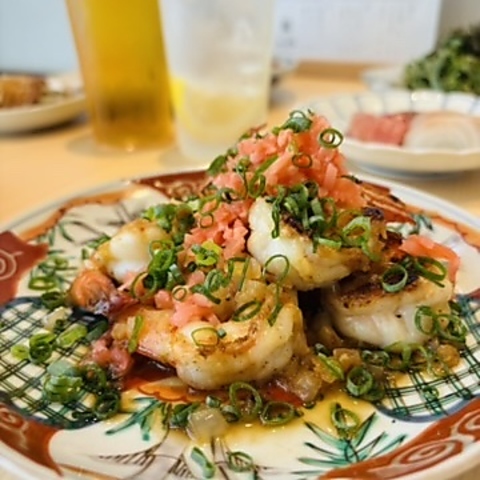 ハワイ好きの店主が考案した創作のガーリックシュリンプ。バター醤油と紅生姜が癖になる名物料理。