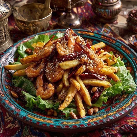 見た目も華やかで食欲をそそる斬新なメニューです。カリッと揚げたフライドポテトと、香ばしく炒めたプリプリのエビを豪快に盛り付けました。甘辛くスパイシーなタレとゴマが絡み合い、じゃがいもと魚介という意外な組み合わせが絶妙なハーモニーを生み出します。異国情緒を感じさせる、当店の人気メニューのひとつです。