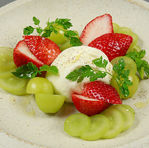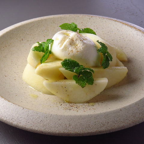 旬の果物や野菜と合わせて仕立てる「季節のブッラータ」は、ミルキーな味わいが際立つフレンチ仕立ての前菜。とろけるようなフレッシュチーズに旬素材の甘みと酸味が重なり、ワインとの相性も格別。軽やかで洗練された新店らしい逸品です。