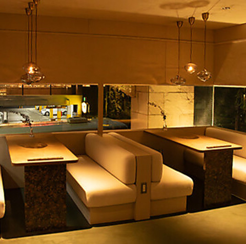 片側一面がガラス張り の店内は、席ごとに異なる幻想的な世界観が広がります。水面のライティングが美しいテーブル席、雲を表現したカウンター、滝を思わせる個室と、おしゃれな新店 の細部にまでこだわりが光ります。