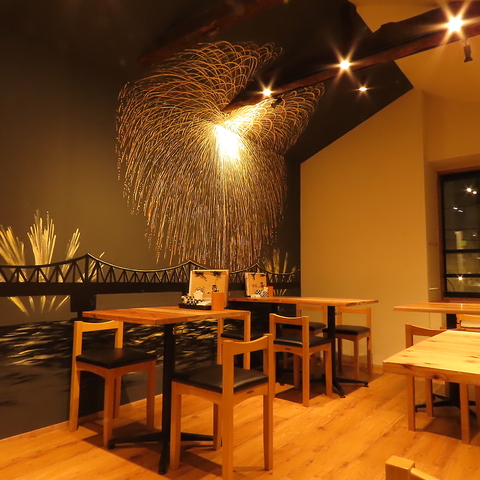 新潟長岡花火の壁画が彩る2階テーブル席!大人数の宴会や貸し切りにも対応♪2階はゆったりとしたテーブル席となっており、ご家族やご友人、会社のご宴会など、グループでのご利用に最適です。壁には、創業者の地元である新潟県長岡市の名物「長岡花火」のダイナミックな壁画が描かれており、空間に華を添えています。