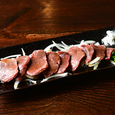 昔のレバ刺し風に楽しめる「牛レバー刺し」は、低温調理で安心安全にご提供しています。口の中でとろけるような独特の食感は、レバー好きにはたまりません!ごま油と塩、ニンニクでお召し上がりください。焼酎や日本酒にも合う大人の一品です。