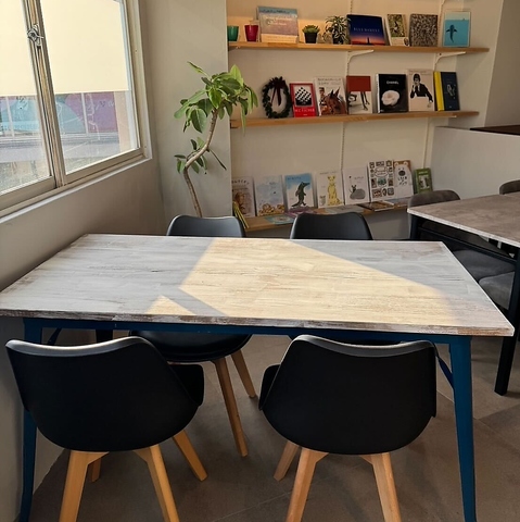明るい日差しが差し込むテーブル席で、シンプルな木目のテーブルとモダンな黒い椅子が心地よい空間を演出します。背後には本が並ぶ棚があり、静かなひとときを楽しむのにぴったりです。友人と語らうもよし、一人で読書にふけるもよし、穏やかな雰囲気が心を癒してくれます。さらに、柔らかな光が特別な時間を彩ります。