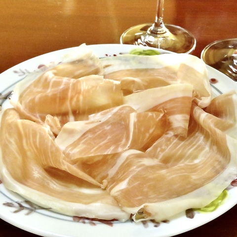 群馬県産東毛地区にて、土地の銘柄豚「くちどけ加藤ポーク」と天然海塩のみを使ってイタリアの昔ながらの製法にて作られる無添加・長期熟成生ハム。本場イタリアのパルマの生ハムにも引けを取らない旨味・香りと、空風生ハムならではの柔らかい塩味が特徴です。愛知県では今のところ、当店のみの取り扱いです。オーダー毎にスライサーで極薄切り立てにてご提供いたします。