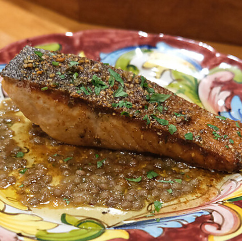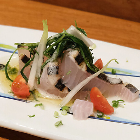 新鮮な三重産カマスサワラを軽く炙り、香ばしさをプラスした贅沢なカルパッチョ。磯の風味豊かなおかひじきと合わせ、爽やかにドレッシングでいただくおすすめのサラダ。旬の魚介と海藻の食感が楽しく、見た目も涼やかなひと皿です。