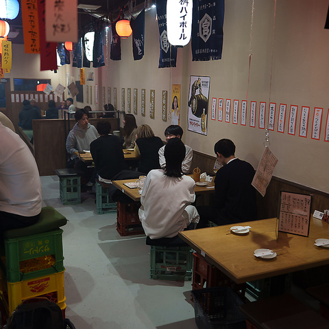 当店は、開放的で広々とした造りが特徴です。どこか懐かしい屋台の雰囲気を味わえる空間で、ワイワイ賑やかに宴会をお楽しみいただけます。最大40名様までの大人数でのご宴会に対応しており、深夜0時まで営業しているため、1次会はもちろん、2次会などでのご利用にも最適です。