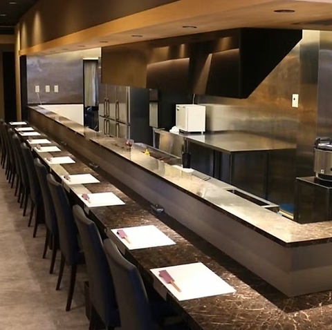 扉を開けると目の前に広がるのは、調理の様子を間近で見られるカウンター席です。シェフの鮮やかな手さばきや、鉄板から立ち上る香ばしい香り、食材が焼ける音など、五感全てで料理を楽しめる特等席。臨場感あふれるオープンキッチンのスタイルは、お食事の時間をより一層盛り上げてくれます。
