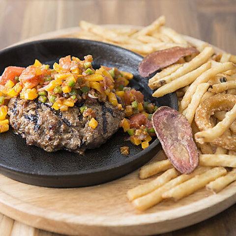 バーグ人気No1。オーダーごとに作るフレッシュサルサと粗挽き ハンバーグは、中毒な味です。おすすめトッピングは、チーズです。