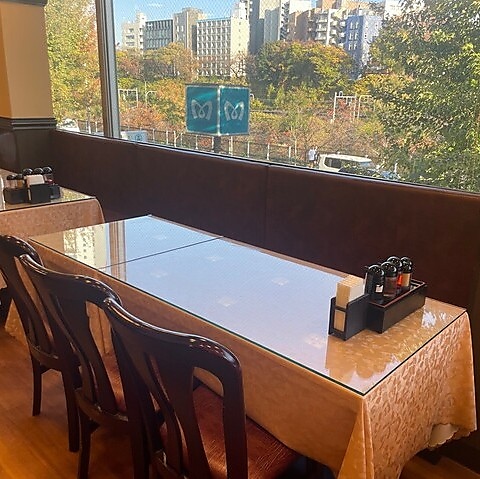 2階のメインフロアに広がるテーブル席は、窓一面に映し出される皇居外堀の豊かな緑と水辺の景色が自慢です。昼間は穏やかな日差しと開放感に包まれ、夜になれば水面に映る街明かりが幻想的なムードを演出します。
