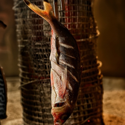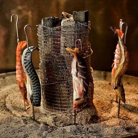 お店に一歩踏み込むと、フワッと漂う焼き魚の良い香り。沖縄県魚「グルクン」や「トロイワシ」「有頭えび」「鮎」「鮭」「鯖」を串に刺し、囲炉裏でじっくり焼き上げます。30分程かかるの場合もあるので、先に注文して沖縄料理をつまみながらお待ちいただくのが◎魚はふっくらした身から濃厚な旨味が溢れ、お酒が進みます☆