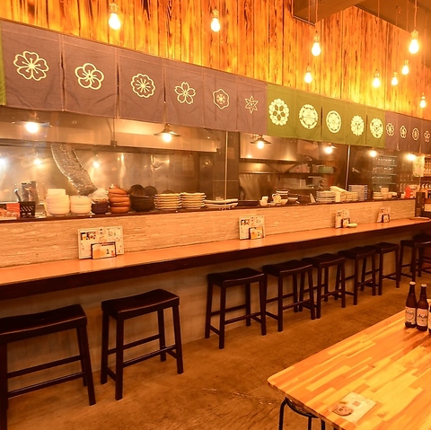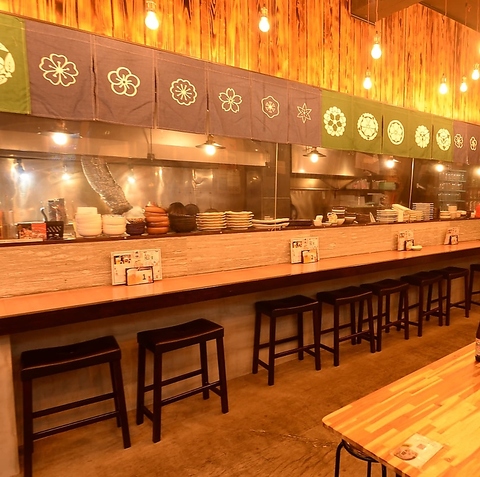 木のぬくもりを感じる温かい雰囲気の店内。テーブル席では、料理やドリンクや並んでも慌てる心配がなく、ゆったりと宴会をお愉しみ頂けます。カウンター席の目の前はオープンキッチン、料理が仕上がっていく工程を眺めることが出来る特等席なので、ライブ感が楽しめると話題♪お一人様・少人数・グループ・団体様に合わせてお席をご案内します◎