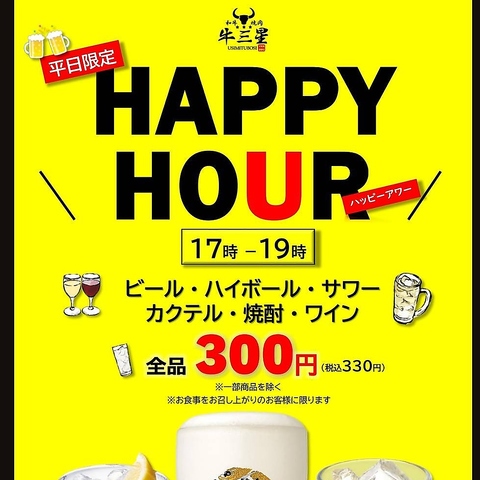 お得なハッピーアワー!平日に開催される「ハッピーアワー」は17時~19時ドリンク全品330円!!