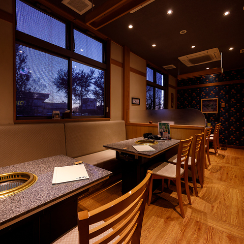 木の温もりが広がる落ち着いた和空間が魅力の店内。掘りごたつ席はゆったりとくつろげる造りで、家族連れや大切な人との食事にもぴったりです。温かい照明が料理をより引き立て、ゆったりと焼肉を楽しめる贅沢な時間を演出してくれます。