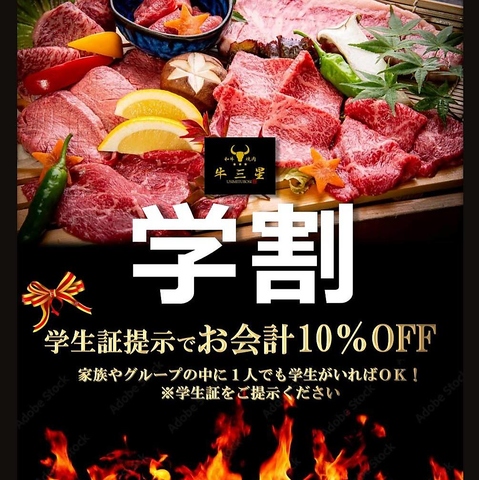 学生証提示でお会計10%OFF!お腹もお財布も満足な学割サービスです。
